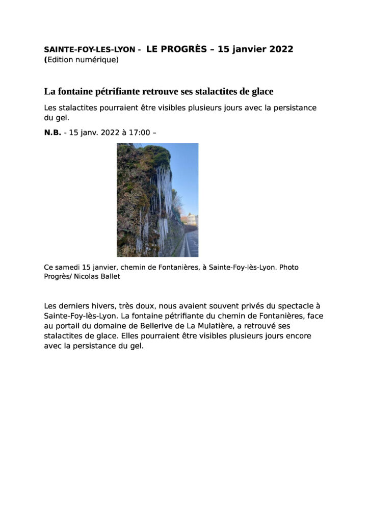 Sainte-Foy-lès-Lyon – La fontaine pétrifiante retrouve ses stalactites de glace – Le Progrès – 15 janvier 2022 La Fontanière Association il y a 4 ans